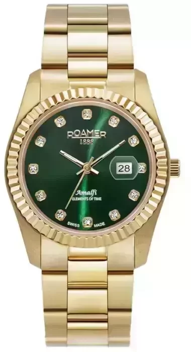 Damski zegarek Roamer 852844 48 79 20 to zegarek, który dzięki swemu wzornictwu zawsze będzie prezentował się dobrze. Cyferblat zegarka jest w kolorze zielonym. Zegarek ten pokazuje godzinę w formacie analogowym dzięki temu odczyt jest bezproblemowy. Koperta w barwach koloru złotego szeroka jest na 34 mm oraz ma grubość 10 mm - wyróżnia się okrągłym kształtem.
