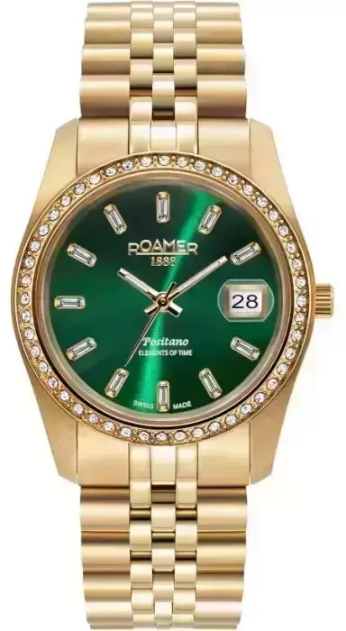Zegarek damski 853858 48 79 20 marki Roamer to ciekawa pozycja dla ludzi ceniących sobie dbałość o szczegóły oraz sprawne działanie mechanizmów. Charakter zapewnia wysokiej klasy cyferblat w kolorze zielonym. Zegarek ten prezentuje godzinę w formacie analogowym dzięki temu odczyt jest bezproblemowy. Koperta została pokryta kolorem złotym szeroka jest na 34 mm oraz ma grubość 10 mm - w kształcie okrągłym.
