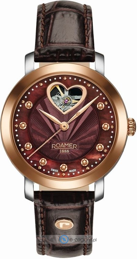 Model damski 556661 49 69 05 marki Roamer należy do serii Lady Sweetheart. Ciekawą budowę czasomierza osiągnięto dzięki tarczy w kolorze brązowym. Koperta szeroka jest na 34 mm - ma okrągły kształt.