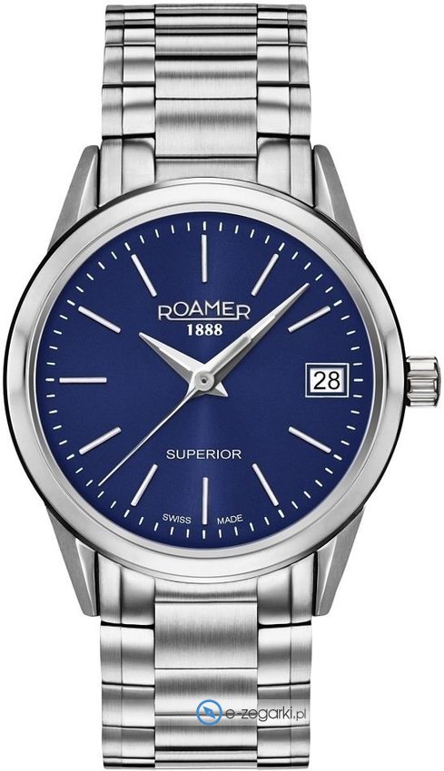 Zegarek 508856 41 45 50 marki Roamer to gustowny zegarek naręczny damski, który jest wyposażony w ciekawe rozwiązania i funkcje. Model ten występuje w kolekcji Roamer Superior 3H Ladies. Tarcza zegarka jest w kolorze granatowym. Aktualna godzina przedstawiona jest w sposób analogowy co intuicyjnie pozwala ją odczytać. Koperta została ozdobiona kolorem stalowym szeroka jest na 30 mm - posiada okrągły kształt.