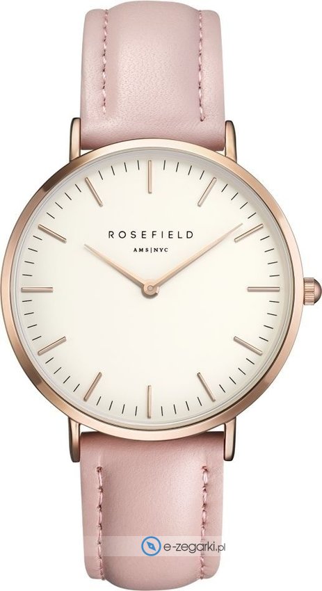 Damski zegarek BWPR-B7 z kolekcji Rosefield Bowery marki Rosefield to połączenie smaku i nowatorskich funkcji. Wysokiej jakości cyferblat zegarka pokryto białym kolorem. Aktualna godzina przedstawiona jest w sposób analogowy co bez trudu pozwala ją odczytać. Koperta została pokryta kolorem różowo złotym szeroka jest na 38 mm oraz ma grubość 7 mm - cechuje się okrągłym kształtem.