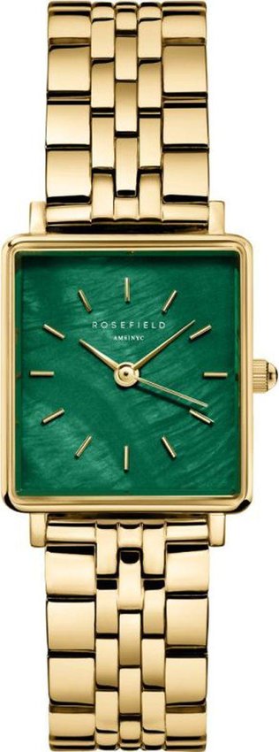 Zegarek damski BEGSG-Q050 marki Rosefield to stylowe połączenie funkcjonalności oraz ciekawego wzornictwa. Model ten w gamie pozostałych zegarków tego producenta występuje w serii Rosefield Boxy. Charakter zapewnia wysokiej jakości tarcza w kolorze zielonym. Pokazana metodą analogową aktualna godzina jest czytelna i łatwa do sprawdzenia. Koperta jest w kolorze złotym o grubości 7 mm - charakteryzuje się prostokątnym kształtem.