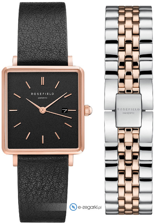 Damski zegarek MFQBR-X231 z kolekcji Rosefield Boxy marki Rosefield to połączenie estetyki oraz pomysłowych funkcji. Stylu nadaje wysokiej jakości cyferblat w kolorze czarnym. Pokazana metodą analogową bieżąca godzina jest czytelna i łatwa do odczytania. Koperta w odcieniach koloru różowo złotego szeroka jest na 26 mm - posiada prostokątny kształt.