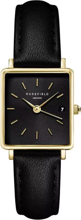 Zegarek damski QBBLG-Q53 marki Rosefield to idealne połączenie funkcjonalności i modnego wzornictwa. Model ten w gamie pozostałych zegarków tego producenta występuje w serii Rosefield Boxy. Styl zapewnia wysokiej jakości cyferblat w kolorze czarnym. Aktualna godzina zaprezentowana jest w sposób analogowy co niezmiernie łatwo pozwala ją odczytać. Koperta została ozdobiona kolorem złotym szeroka jest na 22 mm oraz ma grubość 7 mm - posiada prostokątny kształt.