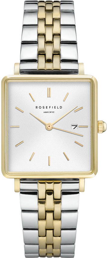Damski zegarek QVSGD-Q013 z serii Rosefield Boxy marki Rosefield to połączenie smaku oraz ciekawych mechanizmów. Wysokiej trwałości cyferblat zegarka ozdobiono srebrnym kolorem. Godzina prezentowana jest w sposób analogowy co bez trudu pozwala ją odczytać. Koperta jest w kolorze złotym szeroka jest na 26 mm oraz ma grubość 6.8 mm.