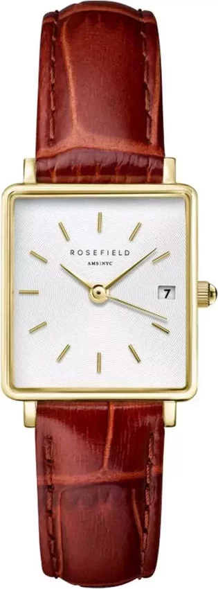 Zegarek damski QWBLG-Q55 marki Rosefield należy do rodziny Rosefield Boxy. Charakteru nadaje wysokiej jakości tarcza w kolorze białym. Aktualna godzina zaprezentowana jest w sposób analogowy co intuicyjnie pozwala ją odczytać. Koperta została pokryta kolorem złotym szeroka jest na 22 mm oraz ma grubość 7 mm - w kształcie prostokątnym.