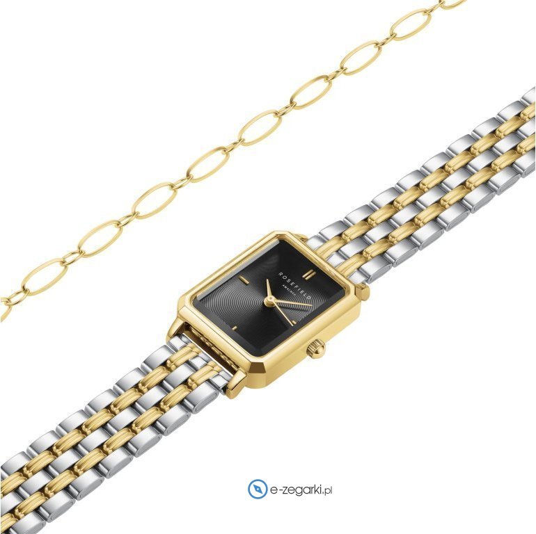 Zegarek damski BDOOG-X290 marki Rosefield to stylowe połączenie funkcjonalności i ciekawego designu. Model ten pochodzi z serii Rosefield Duotone. Wysokiej jakości cyferblat zegarka pokryto czarnym kolorem. Zegarek ten prezentuje godzinę w formacie analogowym dzięki czemu odczyt jest intuicyjny. Koperta w barwach koloru złotego szeroka jest na 20 mm oraz ma grubość 7 mm - w kształcie prostokątnym.