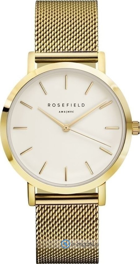 Rosefield MWG-M41 to damski zegarek przeznaczony dla osób szukających zegarka z serii Rosefield Mercer. Charakter zapewnia wysokiej jakości cyferblat w kolorze białym. Zegarek ten prezentuje aktualny czas w formacie analogowym dzięki czemu odczyt jest bezproblemowy. Koperta w barwach koloru złotego szeroka jest na 38 mm oraz ma grubość 8 mm - posiada okrągły kształt.
