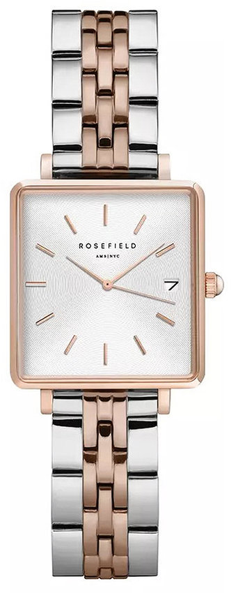 Zegarek damski QMWSSR-Q024 marki Rosefield należy do rodziny Rosefield Mini Boxy. Tarcza zegarka jest w kolorze szarym. Pokazana metodą analogową aktualna godzina jest czytelna i prosta do odczytania. Koperta w odcieniach koloru różowo złotego szeroka jest na 22 mm - cechuje się prostokątnym kształtem.