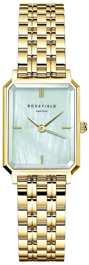 Zegarek damski OGGSG-O71 marki Rosefield to stylowe połączenie funkcjonalności a także modnego wzornictwa. Model ten należy do serii Rosefield Octagon XS. Stylu dodaje wysokiej klasy tarcza w kolorze zielonym. Zegarek ten pokazuje godzinę w formacie analogowym dzięki temu odczyt jest intuicyjny. Koperta jest ozdobiona kolorem złotym o grubości 7 mm - w kształcie prostokątnym.