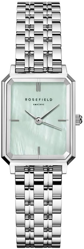 Zegarek damski OGGSS-O72 marki Rosefield z kolekcji Rosefield Octagon XS. Cyferblat zegarka jest w kolorze zielonym. Aktualna godzina zaprezentowana jest w sposób analogowy co niezmiernie łatwo pozwala ją odczytać. Koperta jest w kolorze srebrnym o grubości 7 mm - charakteryzuje się prostokątnym kształtem.