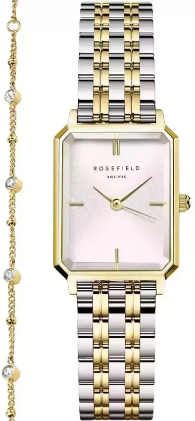 Model damski OWDSG-X279 marki Rosefield z rodziny Rosefield Octagon XS. Cyferblat zegarka jest w kolorze perłowym. Zegarek ten prezentuje aktualny czas w formacie analogowym dzięki czemu odczyt jest intuicyjny. Koperta została pokryta kolorem złotym o grubości 7 mm - charakteryzuje się prostokątnym kształtem.