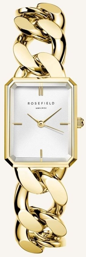 Damski zegarek SWGSG-O55 z kolekcji Rosefield Octagon XS marki Rosefield to połączenie stylu oraz ciekawych funkcji. Nieschematyczny wygląd czasomierza osiągnięto m.in. poprzez cyferblat w kolorze białym. Aktualna godzina zaprezentowana jest w sposób analogowy co intuicyjnie pozwala ją odczytać. Koperta jest pokryta kolorem złotym szeroka jest na 20 mm oraz ma grubość 7 mm - w kształcie prostokątnym.