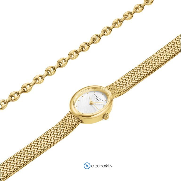 Zegarek MOGCB-X289 marki Rosefield to stylowy zegarek naręczny damski, który jest wyposażony w pomysłowe rozwiązania i funkcje. Model ten występuje w kolekcji Rosefield Oval. Nieschematyczny wygląd zegarka uzyskano również dzięki tarczy w kolorze białym. Zegarek ten pokazuje godzinę w formacie analogowym dzięki czemu odczyt jest bezproblemowy. Koperta jest w kolorze złotym szeroka jest na 24 mm oraz ma grubość 7 mm - charakteryzuje się owalnym kształtem.