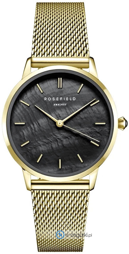 Zegarek damski RBGMG-R07 należy do rodziny Rosefield Pearl Edit marki Rosefield. Atrakcyjny wygląd czasomierza osiągnięto m.in. poprzez tarczę w kolorze czarnym. Pokazana metodą analogową bieżąca godzina jest czytelna i prosta do sprawdzenia. Koperta w odcieniach koloru złotego szeroka jest na 36 mm oraz ma grubość 8 mm - posiada okrągły kształt.