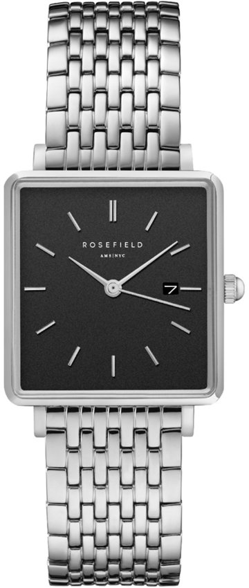 Model QBSS-Q07 marki Rosefield to stylowy zegarek naręczny damski, który posiada pomysłowe rozwiązania i funkcje. Nieschematyczny wygląd czasomierza uzyskano dzięki tarczy w kolorze czarnym. Koperta w odcieniach koloru stalowego szeroka jest na 12 mm - w kształcie prostokątnym.
