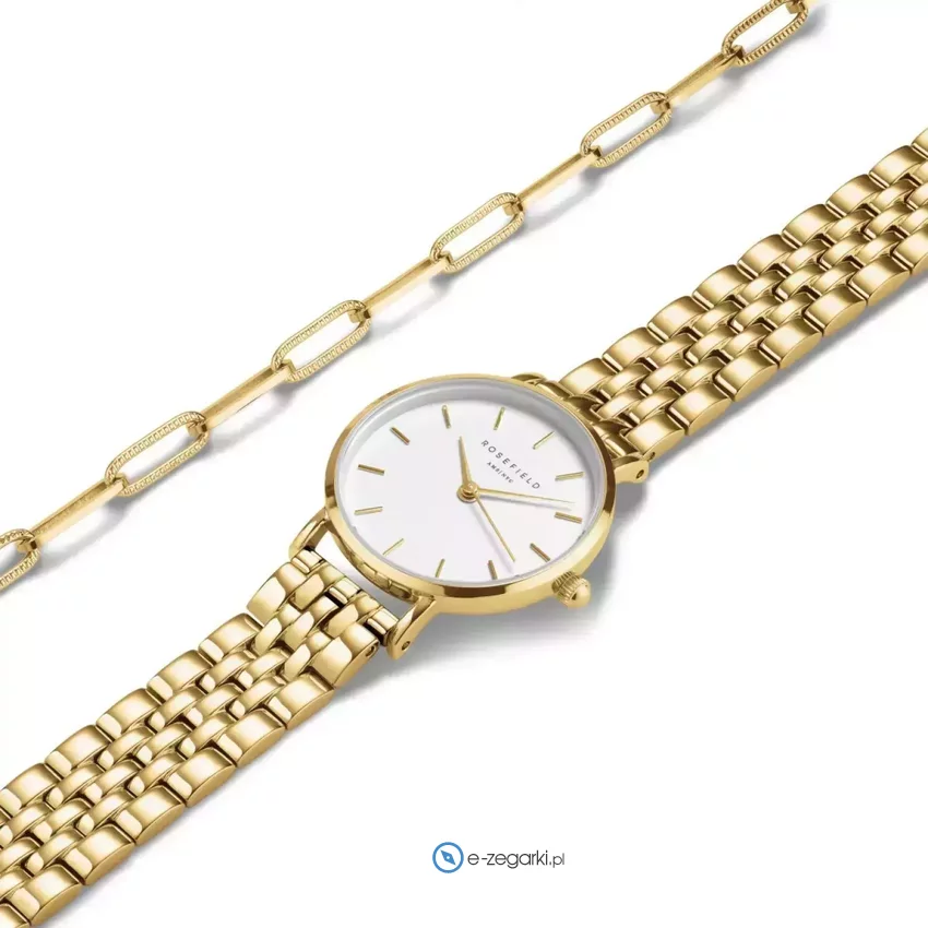 Zegarek damski 26WGSG-X278 marki Rosefield to idealne połączenie funkcjonalności a także ciekawego wzornictwa. Model ten w gamie innych zegarków tego producenta występuje w kolekcji Rosefield Small Edit. Wysokiej trwałości cyferblat zegarka ozdobiono białym kolorem. Aktualna godzina prezentowana jest w sposób analogowy co niezmiernie łatwo pozwala ją odczytać. Koperta jest ozdobiona kolorem złotym szeroka jest na 26 mm oraz ma grubość 7 mm - posiada okrągły kształt.