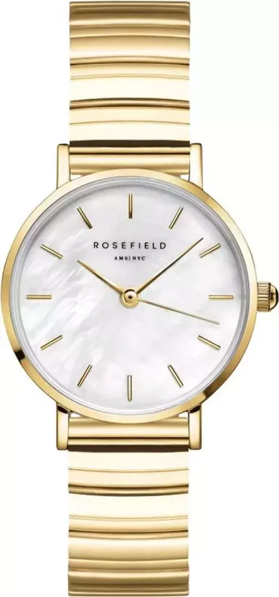 Zegarek SEWGSG-SE02 marki Rosefield to elegancki zegarek naręczny damski, który wyposażono w pomysłowe rozwiązania i funkcje. Model ten zalicza się do serii Rosefield Small Edit. Niebanalną konstrukcję czasomierza uzyskano z pomocą tarczy w kolorze perłowym. Zaprezentowana metodą analogową aktualna godzina jest czytelna i prosta do sprawdzenia. Koperta w odcieniach koloru złotego szeroka jest na 26 mm oraz ma grubość 7 mm - ma okrągły kształt.