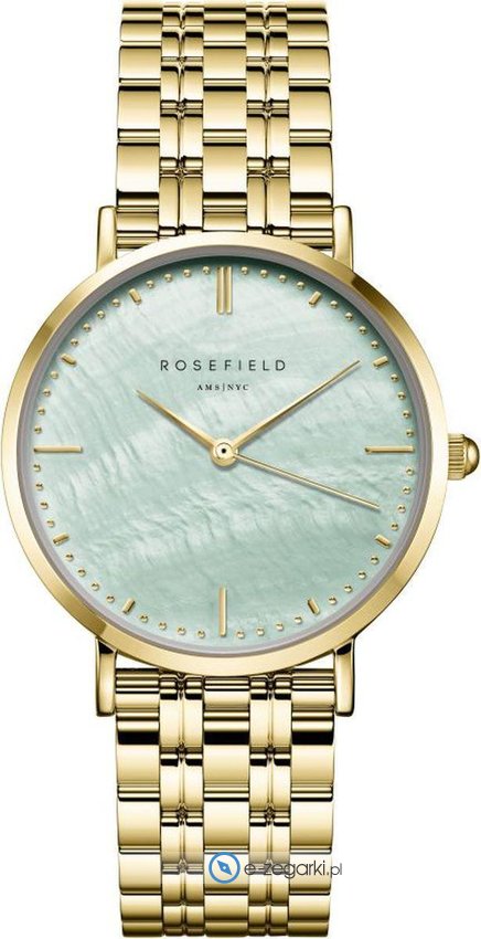 Zegarek damski UGGSG-U37 marki Rosefield z kolekcji Rosefield Upper East Side. Stylu dodaje wysokiej klasy tarcza w kolorze zielonym. Pokazana metodą analogową aktualna godzina jest czytelna i szybka do sprawdzenia. Koperta w barwach koloru złotego szeroka jest na 33 mm oraz ma grubość 8 mm - ma okrągły kształt.