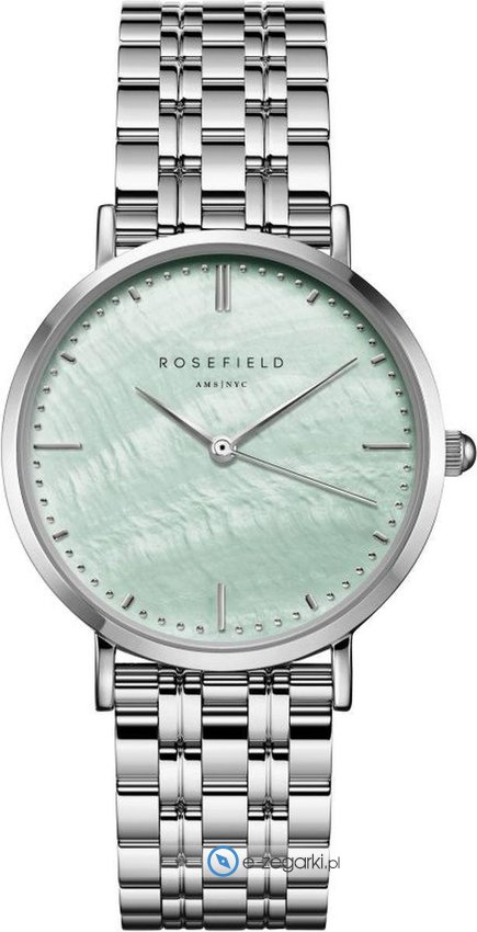 Zegarek damski UGSSS-U38 marki Rosefield z kolekcji Rosefield Upper East Side. Wysokiej trwałości tarczę zegarka ozdobiono zielonym kolorem. Aktualna godzina pokazywana jest w sposób analogowy co bez trudu pozwala ją odczytać. Koperta w barwach koloru srebrnego szeroka jest na 33 mm oraz ma grubość 8 mm - charakteryzuje się okrągłym kształtem.