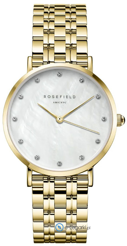 Rosefield UWGSG-U31 to damski zegarek kierowany dla osób szukających zegarka z serii Rosefield Upper East Side. Ciekawy wygląd zegarka osiągnięto również dzięki tarczy w kolorze perłowym. Zaprezentowana metodą analogową bieżąca godzina jest czytelna i łatwa do odczytania. Koperta jest w kolorze złotym szeroka jest na 33 mm oraz ma grubość 8 mm - ma okrągły kształt.