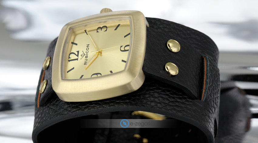 Model RNAC93GMGX03BX marki Rubicon to stylowy zegarek naręczny damski, który wyposażono w pomysłowe rozwiązania oraz funkcje. Niebanalną konstrukcję czasomierza osiągnięto z pomocą tarczy w kolorze złotym. Zaprezentowana metodą analogową bieżąca godzina jest czytelna i łatwa do sprawdzenia. Koperta jest w kolorze złotym szeroka jest na 39 mm oraz ma grubość 10 mm.