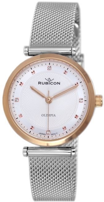 Model RNBD86TISX03BX marki Rubicon to elegancki zegarek naręczny damski, który jest wyposażony w ciekawe rozwiązania oraz funkcje. Ciekawy wygląd czasomierza osiągnięto również dzięki tarczy w kolorze jasnym. Pokazana metodą analogową bieżąca godzina jest czytelna i prosta do sprawdzenia. Koperta w odcieniach koloru różowo złotego szeroka jest na 30 mm oraz ma grubość 8 mm - posiada okrągły kształt.