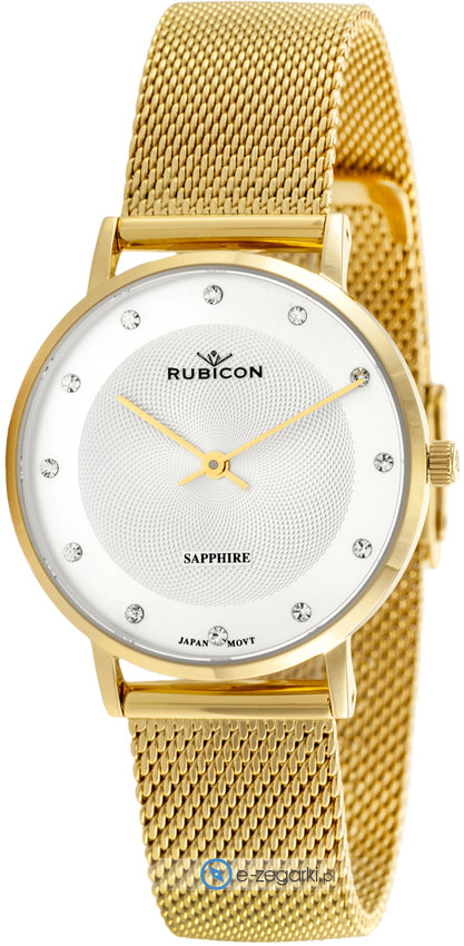 Model RNBD88GISX03B1 marki Rubicon to stylowy zegarek naręczny damski, który jest wyposażony w ciekawe rozwiązania i funkcje. Wysokiej jakości tarczę zegarka pokryto srebrnym kolorem. Pokazana metodą analogową aktualna godzina jest czytelna i prosta do odczytania. Koperta jest w kolorze złotym szeroka jest na 32 mm oraz ma grubość 7 mm - wyróżnia się okrągłym kształtem.