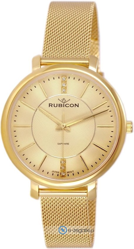 Zegarek damski RNBE04GIGX03BX marki Rubicon to idealne połączenie funkcjonalności a także modnego wzornictwa. Styl zapewnia wysokiej jakości cyferblat w kolorze złotym. Godzina prezentowana jest w sposób analogowy co bez trudu pozwala ją odczytać. Koperta jest w kolorze złotym szeroka jest na 36 mm oraz ma grubość 8 mm - charakteryzuje się okrągłym kształtem.