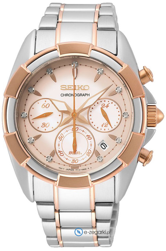 Zegarek damski SRWZ02P1 marki Seiko to idealne połączenie funkcjonalności i ciekawego wzornictwa. Model ten należy do kolekcji Seiko Chronograph. Charakterystyczną konstrukcję zegarka uzyskano dzięki tarczy w kolorze różowo złotym. Godzina pokazywana jest w sposób analogowy co intuicyjnie pozwala ją odczytać. Koperta szeroka jest na 36 mm oraz ma grubość 11 mm - wyróżnia się okrągłym kształtem.