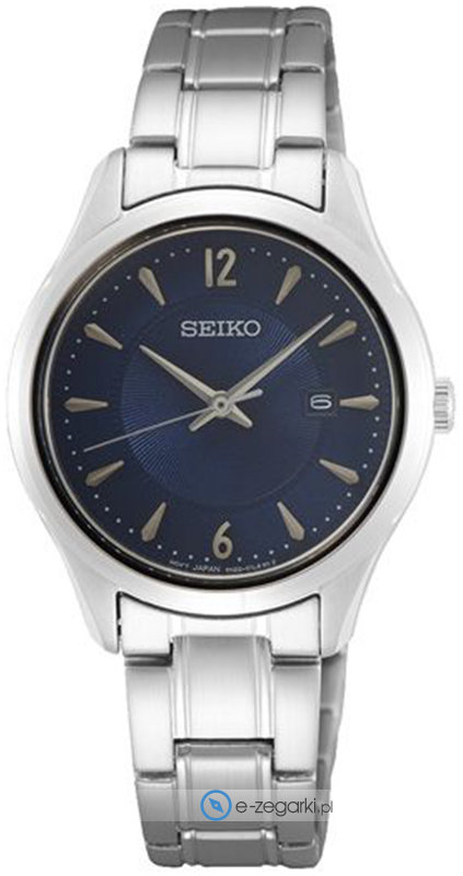 Zegarek damski SUR425P1 marki Seiko to dobre połączenie funkcjonalności a także ciekawego designu. Wysokiej trwałości tarczę zegarka pokryto niebieskim kolorem. Zegarek ten prezentuje aktualny czas w formacie analogowym dzięki czemu odczyt jest bardzo łatwy. Koperta w barwach koloru srebrnego szeroka jest na 30 mm oraz ma grubość 8 mm - ma okrągły kształt.