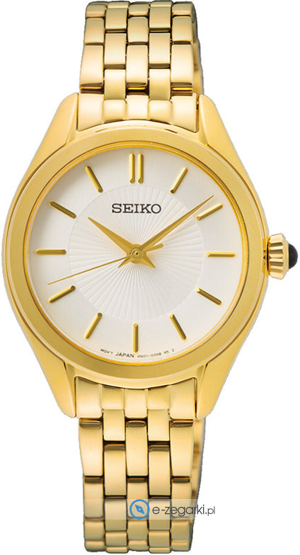 Zegarek damski SUR538P1 marki Seiko to idealna pozycja dla ludzi ceniących sobie dbałość o detale oraz bezproblemowe zachowanie mechanizmów. Atrakcyjny wygląd zegarka osiągnięto także dzięki tarczy w kolorze srebrnym. Aktualna godzina prezentowana jest w sposób analogowy co bez trudu pozwala ją odczytać. Koperta w barwach koloru złotego szeroka jest na 29 mm oraz ma grubość 7 mm - cechuje się okrągłym kształtem.