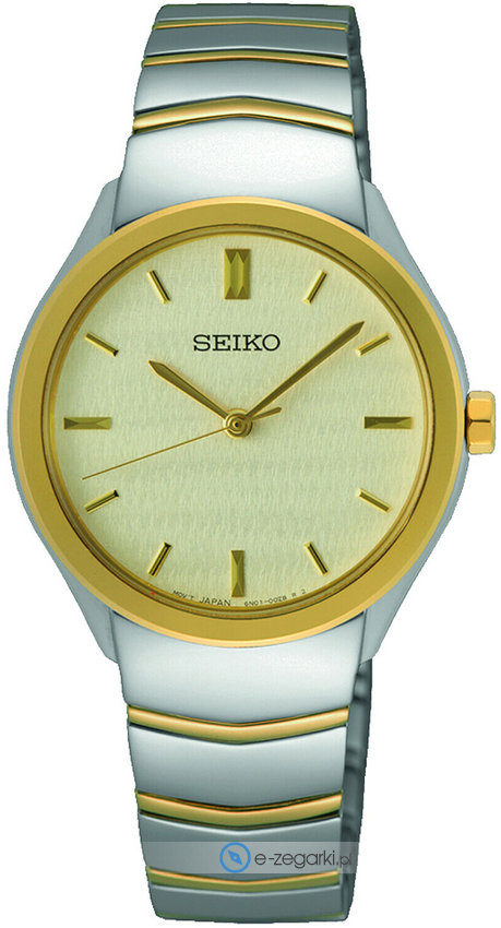 Damski zegarek Seiko SUR550P1 to zegarek, który dzięki swemu wzornictwu zawsze będzie prezentował się dobrze. Nieschematyczny wygląd czasomierza uzyskano także dzięki tarczy w kolorze złotym. Aktualna godzina pokazywana jest w sposób analogowy co niezmiernie łatwo pozwala ją odczytać. Koperta jest w kolorze srebrnym szeroka jest na 30 mm oraz ma grubość 7 mm - posiada okrągły kształt.