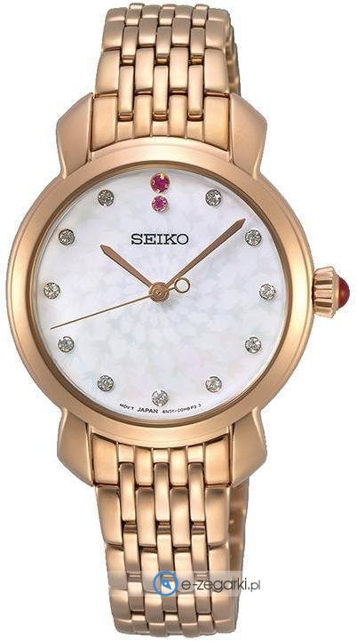Zegarek damski SUR624P1 marki Seiko to dobra propozycja dla ludzi ceniących sobie dbałość o detale jak również bezawaryjne funkcjonowanie mechanizmów. Niebanalną konstrukcję czasomierza uzyskano dzięki tarczy w kolorze białym. Aktualna godzina pokazywana jest w sposób analogowy co niezmiernie łatwo pozwala ją odczytać. Koperta w odcieniach koloru złotego szeroka jest na 29.2 mm oraz ma grubość 8 mm - ma okrągły kształt.