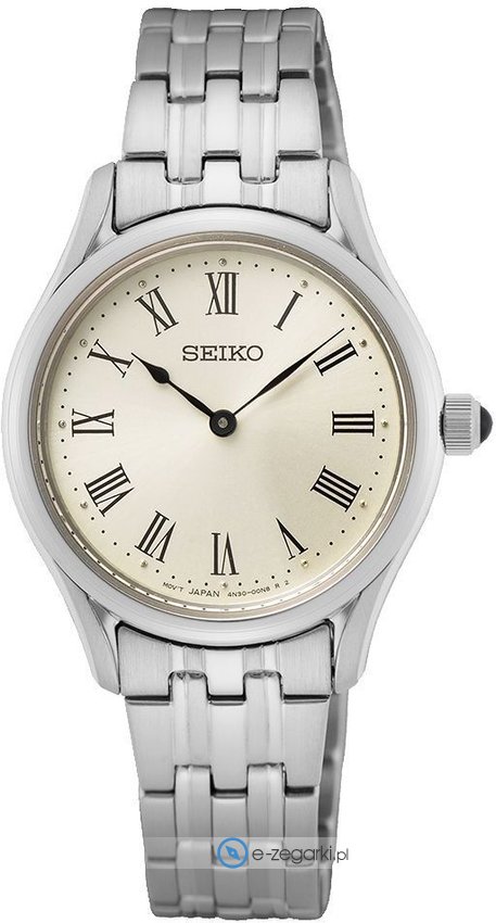 Zegarek damski SWR069P1 marki Seiko to ciekawa pozycja dla ludzi ceniących sobie dbałość o szczegóły oraz sprawne zachowanie mechanizmów. Charakter zapewnia wysokiej klasy tarcza w kolorze białym. Pokazana metodą analogową bieżąca godzina jest czytelna i łatwa do odczytania. Koperta została pokryta kolorem szarym szeroka jest na 29 mm - w kształcie okrągłym.