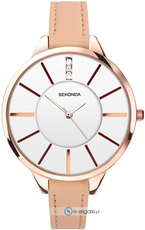 Damski zegarek Sekonda 2013.00 to zegarek, który dzięki swemu wzornictwu zawsze będzie prezentował się dobrze. Charakterystyczny wygląd czasomierza uzyskano także dzięki tarczy w kolorze białym. Zegarek ten prezentuje godzinę w formacie analogowym dzięki temu odczyt jest bezproblemowy. Koperta została pokryta kolorem różowo złotym szeroka jest na 38 mm oraz ma grubość 10 mm - w kształcie okrągłym.