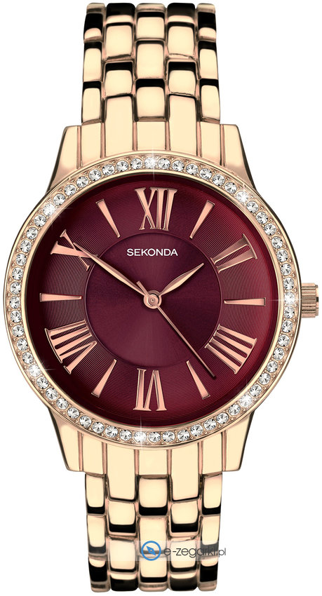 Damski zegarek Sekonda 40290.00 to zegarek, który dzięki swemu wzornictwu zawsze będzie prezentował się dobrze. Charakterystyczny wygląd czasomierza osiągnięto także dzięki tarczy w kolorze czerwonym. Zaprezentowana metodą analogową bieżąca godzina jest czytelna i prosta do sprawdzenia. Koperta w odcieniach koloru różowo złotego szeroka jest na 33 mm oraz ma grubość 9 mm - ma okrągły kształt.