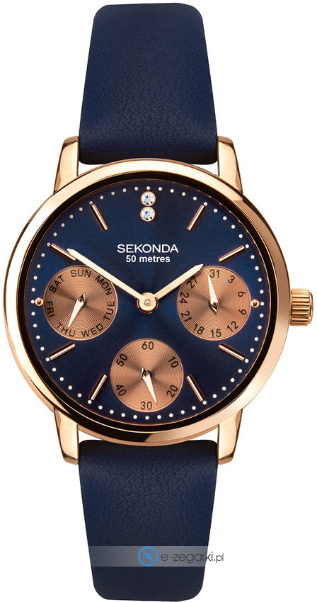 Model 40304.00 marki Sekonda to gustowny zegarek naręczny damski, który jest wyposażony w ciekawe rozwiązania i funkcje. Wysokiej jakości tarczę zegarka pokryto niebieskim kolorem. Godzina zaprezentowana jest w sposób analogowy co bez trudu pozwala ją odczytać. Koperta w odcieniach koloru różowo złotego szeroka jest na 37 mm oraz ma grubość 8 mm - charakteryzuje się okrągłym kształtem.