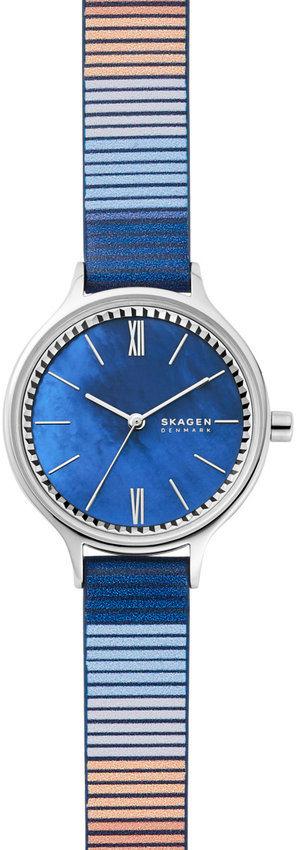 Zegarek damski SKW2906 marki Skagen z rodziny Skagen Anita. Charakterystyczną budowę zegarka uzyskano dzięki tarczy w kolorze niebieskim. Pokazana metodą analogową bieżąca godzina jest czytelna i szybka do sprawdzenia. Koperta jest w kolorze srebrnym szeroka jest na 30 mm - posiada okrągły kształt.