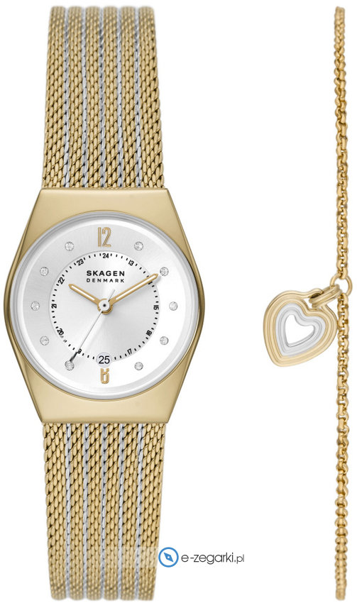 Damski zegarek Skagen SKW1156SET to zegarek, który dzięki swemu wzornictwu zawsze będzie prezentował się dobrze. Cyferblat zegarka jest w kolorze srebrnym. Zaprezentowana metodą analogową bieżąca godzina jest czytelna i łatwa do odczytania. Koperta w barwach koloru złotego szeroka jest na 26 mm - posiada okrągły kształt.