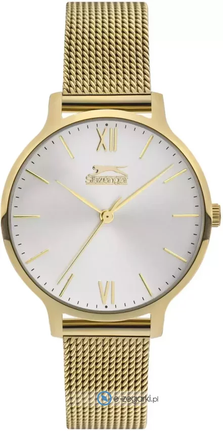 Model SL.09.1823.2.05 marki Slazenger to elegancki zegarek naręczny damski, który posiada ciekawe rozwiązania oraz funkcje. Charakter zapewnia wysokiej klasy tarcza w kolorze srebrnym. Pokazana metodą analogową bieżąca godzina jest czytelna i szybka do odczytania. Koperta jest w kolorze złotym szeroka jest na 34 mm - posiada okrągły kształt.