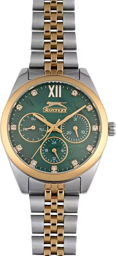 Damski zegarek Slazenger SL.09.1990.4.05 to zegarek, który dzięki swemu wzornictwu zawsze będzie prezentował się dobrze. Ciekawy wygląd czasomierza uzyskano także dzięki tarczy w kolorze zielonym. Aktualna godzina pokazywana jest w sposób analogowy co bez trudu pozwala ją odczytać. Koperta jest w kolorze srebrno złotym szeroka jest na 34 mm - w kształcie okrągłym.