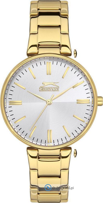 Zegarek damski SL.09.2122.3.05 marki Slazenger to stylowe połączenie funkcjonalności i modnego designu. Tarcza zegarka jest w kolorze srebrnym. Zegarek ten pokazuje aktualny czas w formacie analogowym dzięki temu odczyt jest intuicyjny. Koperta jest w kolorze złotym szeroka jest na 34 mm - w kształcie okrągłym.