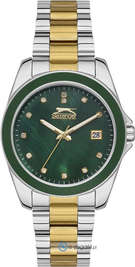 Zegarek damski SL.09.2142.3.03 marki Slazenger to stylowe połączenie funkcjonalności oraz modnego wzornictwa. Wysokiej trwałości cyferblat zegarka pokryto zielonym kolorem. Zaprezentowana metodą analogową aktualna godzina jest czytelna i szybka do sprawdzenia. Koperta jest ozdobiona kolorem srebrnym szeroka jest na 36 mm - w kształcie okrągłym.