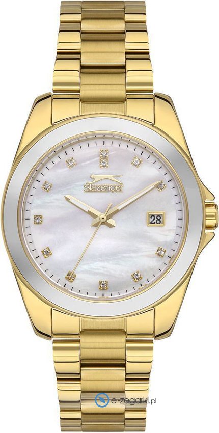 Model SL.09.2142.3.05 marki Slazenger to gustowny zegarek naręczny damski, który jest wyposażony w ciekawe rozwiązania i funkcje. Ciekawy wygląd zegarka osiągnięto także dzięki tarczy w kolorze srebrnym. Aktualna godzina prezentowana jest w sposób analogowy co bez trudu pozwala ją odczytać. Koperta jest w kolorze złotym szeroka jest na 36 mm - w kształcie okrągłym.