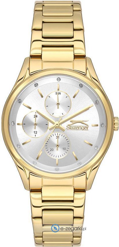 Zegarek damski SL.09.2229.4.05 marki Slazenger to idealna pozycja dla ludzi ceniących sobie dbałość o detale jak również bezawaryjne funkcjonowanie mechanizmów. Tarcza zegarka jest w kolorze srebrnym. Aktualna godzina zaprezentowana jest w sposób analogowy co intuicyjnie pozwala ją odczytać. Koperta jest w kolorze złotym szeroka jest na 36 mm - w kształcie okrągłym.