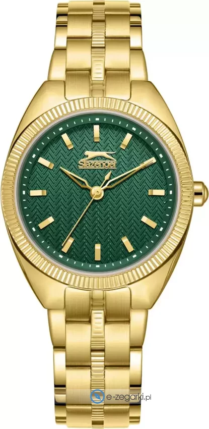 Model SL.09.2344.4.06 marki Slazenger to elegancki zegarek naręczny damski, który wyposażono w ciekawe rozwiązania i funkcje. Charakterystyczny wygląd czasomierza uzyskano m.in. poprzez cyferblat w kolorze zielonym. Zegarek ten prezentuje godzinę w formacie analogowym dzięki czemu odczyt jest bardzo łatwy. Koperta jest w kolorze złotym szeroka jest na 30 mm - wyróżnia się okrągłym kształtem.