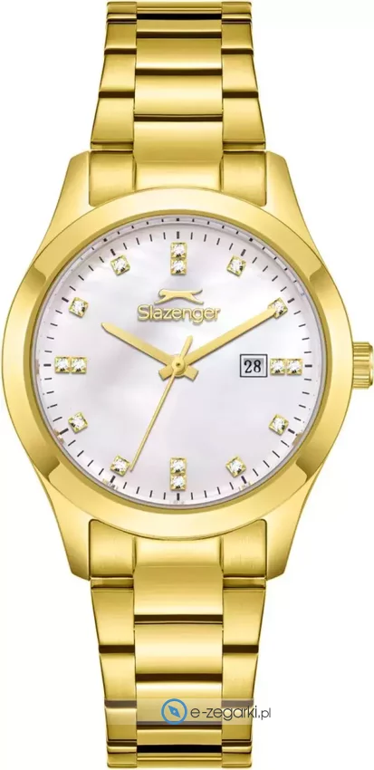 Damski zegarek Slazenger SL.09.2465.3.04 to propozycja dla kobiet ceniących sobie klasyczne rozwiązania z nutą nowoczesności. Ten modny czasomierz to idealny dodatek do każdej stylizacji. Zegarek ten, dzięki swojej uniwersalności, sprawdzi się zarówno na co dzień, jak i podczas specjalnych okazji. Firma Slazenger to firma z wieloletnimi tradycjami sportowymi. Od kilku lat markę tą można zobaczyć, także w zegarkach. Kolekcja zegarków Slazenger jest oryginalna, dynamiczna, pełna werwy oraz przeznaczona do użytku na co dzień. Marka Slazenger łączy w sobie inwestycje w zakresie sportu i aktywnego wypoczynku, a jej zegarki pozostają świadectwem jego połączenia z fanami sportu na całym świecie. Perłowa tarcza nadaje mu subtelności, a złota bransoleta dodaje elegancji. Zegarek posiada mechanizm kwarcowy zasilany baterią, co zapewnia precyzyjne odmierzanie czasu. Koperta o szerokości 32 mm idealnie pasuje na damski nadgarstek, podkreślając jego subtelność i biżuteryjny charakter. Zegarek wyposażono w szkiełko mineralne, które chroni tarczę przed zarysowaniami. Wodoszczelność WR 50 umożliwia krótkotrwałe zamoczenie zegarka.