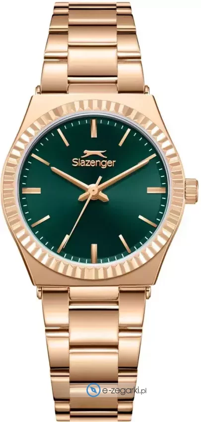 Zegarek damski SL.09.2589.3.470 marki Slazenger to idealne połączenie funkcjonalności a także ciekawego wzornictwa. Stylu dodaje wysokiej klasy cyferblat w kolorze zielonym. Zegarek ten prezentuje aktualny czas w formacie analogowym dzięki temu odczyt jest bezproblemowy. Koperta jest w kolorze różowo złotym szeroka jest na 32 mm - cechuje się okrągłym kształtem.