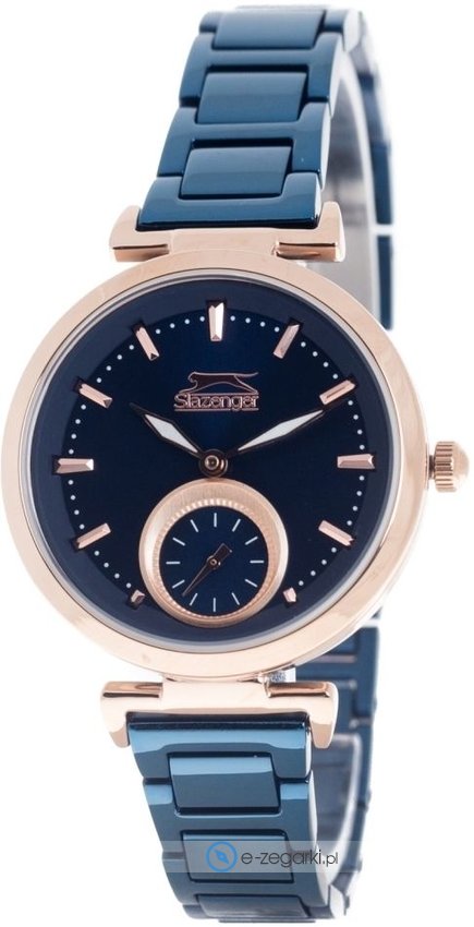 Zegarek damski SL.09.6114.4.03 marki Slazenger to idealne połączenie funkcjonalności i modnego wzornictwa. Nieschematyczny wygląd czasomierza osiągnięto poprzez tarczę w kolorze granatowym. Koperta szeroka jest na 33 mm - charakteryzuje się okrągłym kształtem.